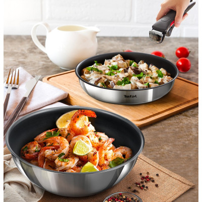 The Tefal Stainless Steel Edition Trimi 3-Piece Frying Pan Set is a premium cookware set combining robust stainless steel construction with detachable handles and advanced coating technology. It offers versatility for various cooking tasks — from simple 1-2 person meals to larger dishes — while enabling easy storage and plating thanks to its removable handle system.