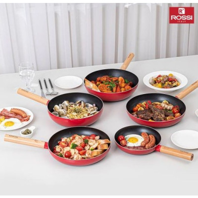 Upgrade your cookware collection with the ROSSI IH Two-Tone Red 5-Piece Pan & Wok Set. These pans are designed with induction compatibility, offering efficient heat conduction. The set includes three frying pans (20 cm, 26 cm, 28 cm) and two woks (26 cm and 28 cm), giving you flexibility for everything from everyday frying to deeper wok-style cooking.